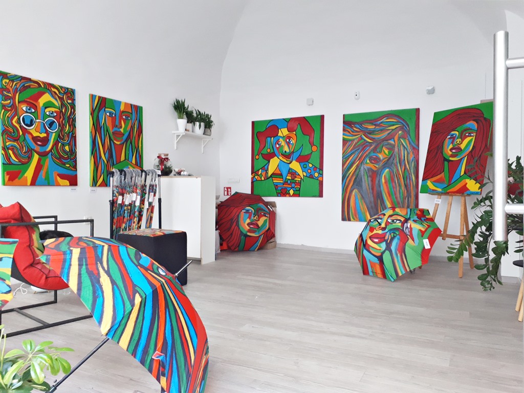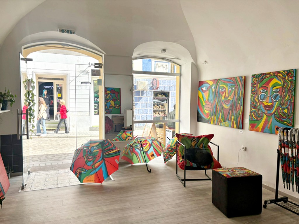 Zakoračimo sada i unutar poslovnog prostora čije je ključeve zakupnica preuzela početkom rujna i iskoristila prvi mjesec slobodan od plaćanja zakupnine za njegovo uređenje i oblikovanje u skladu s potrebama galerije. Uz izložbeni postav, posjetitelje galerije dočekat će i unikatni kišobrani s vizualima s umjetničkih djela, zatim grafike i reprodukcije originala.
