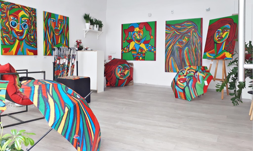 Zakoračimo sada i unutar poslovnog prostora čije je ključeve zakupnica preuzela početkom rujna i iskoristila prvi mjesec slobodan od plaćanja zakupnine za njegovo uređenje i oblikovanje u skladu s potrebama galerije. Uz izložbeni postav, posjetitelje galerije dočekat će i unikatni kišobrani s vizualima s umjetničkih djela, zatim grafike i reprodukcije originala.
