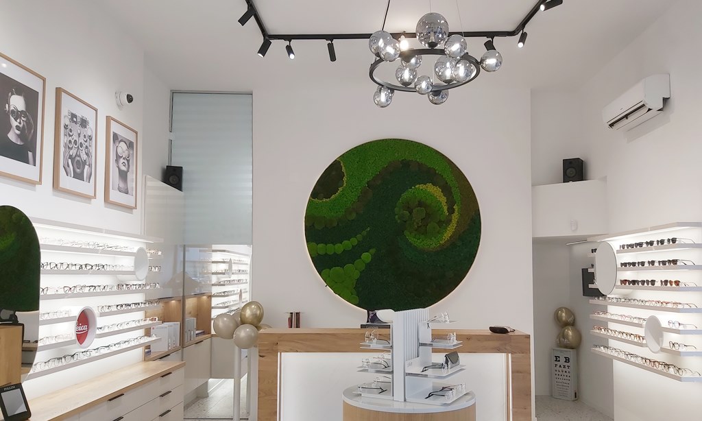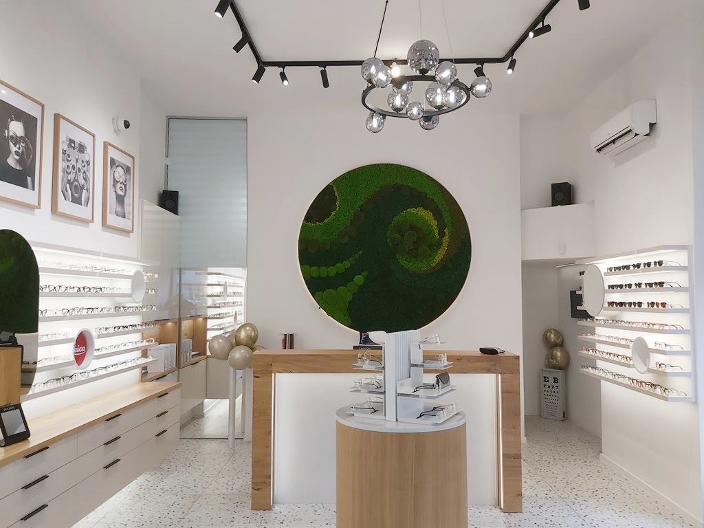 U prostoru prevladava bijela boja uz puno svjetla, a poseban dekorativni detalj koji se lijepo uklapa u prozračnost prostora Optike i čini ga još ugodnijim za oči je okrugli zidni panel od mahovine. Zajedničko je djelo ruku zakupnika i njegove supruge Ivane, a stavimo li zelenilo s panela u kontekst s izraženom nadom i željom zakupnika za cijelu Vlašku, kao da i ono poziva na revitalizaciju Vlaške ulice.